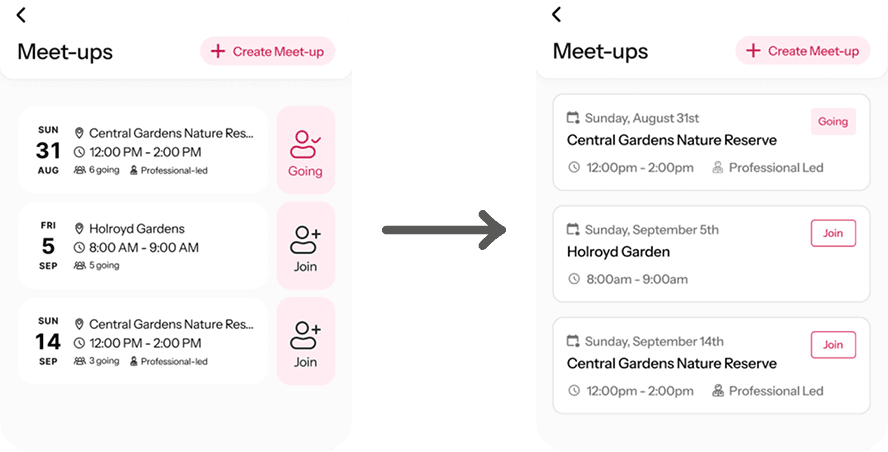 To ensure the cohesiveness of our app’s UI, we adjusted the meet-up cards so that they were consistent with the card on the homepage.