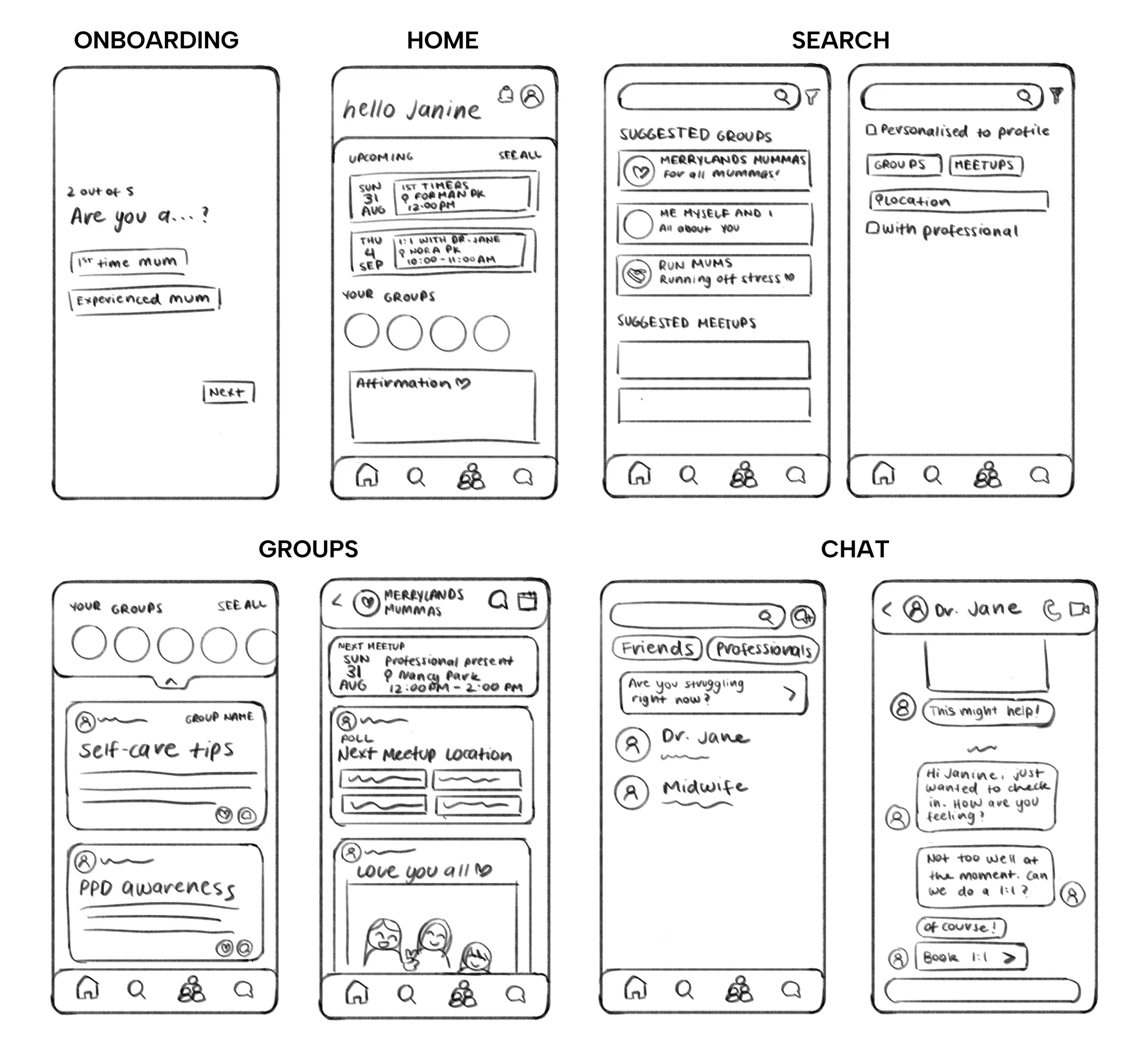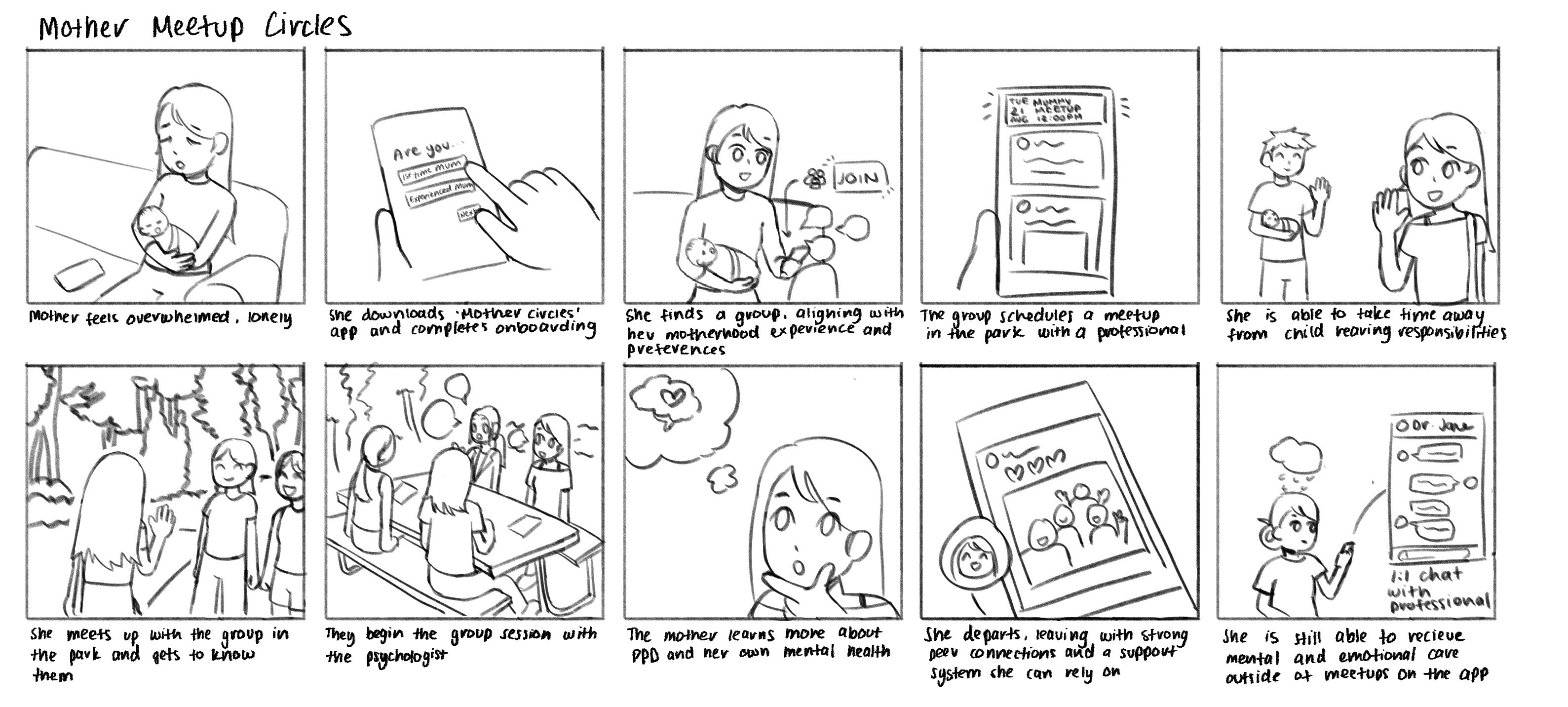 From Crazy 8s, we were drawn towards the idea of cultivating community spaces for mothers (“mother meetups") as we believed it strongly aligned with our key insights. We decided to elaborate on this idea/user journey through role-playing.