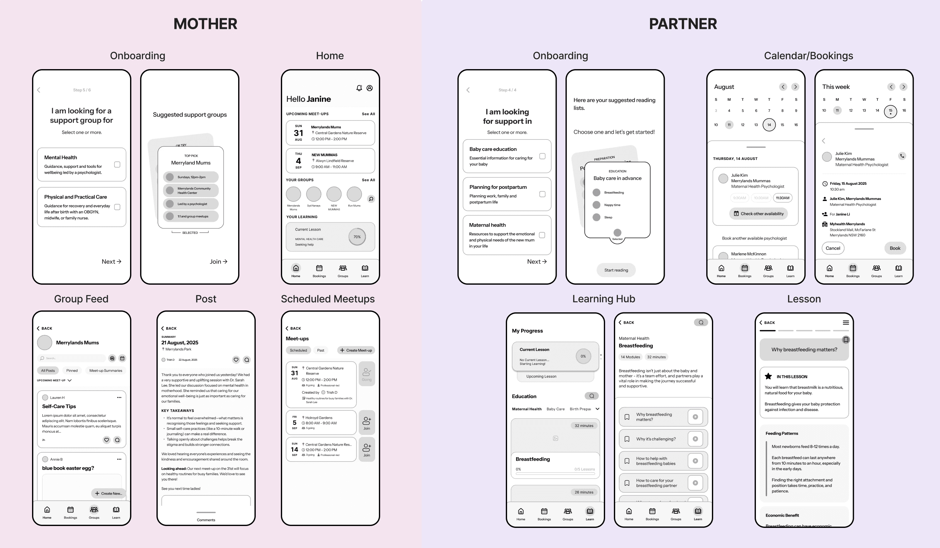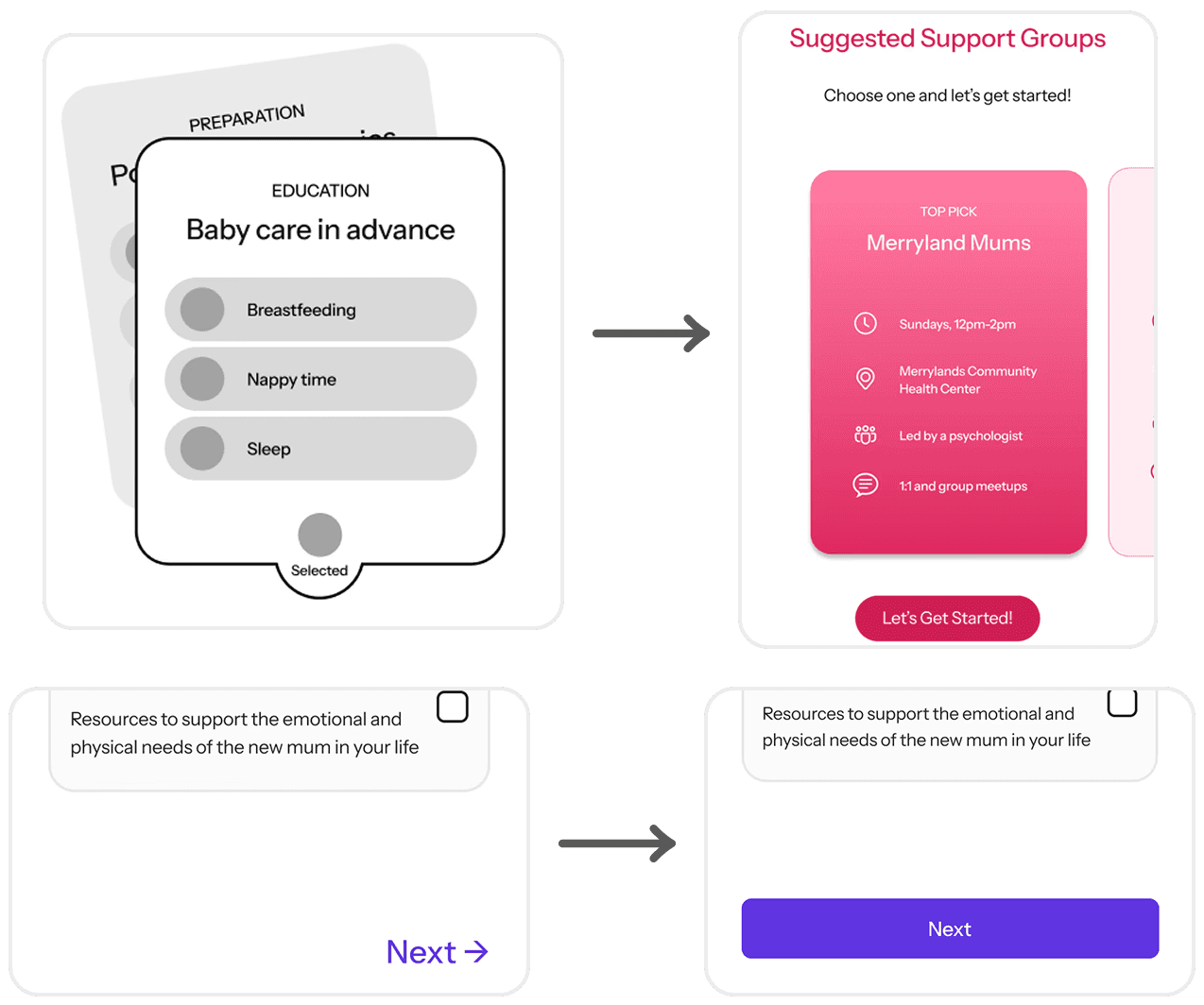 As mentioned earlier, parts of a mother's ecosystem are often not interlinked or hard to access. Thus, we were set on designing a centralised experience that both provides practical support for mothers and encourages the proactiveness of partners and communities.