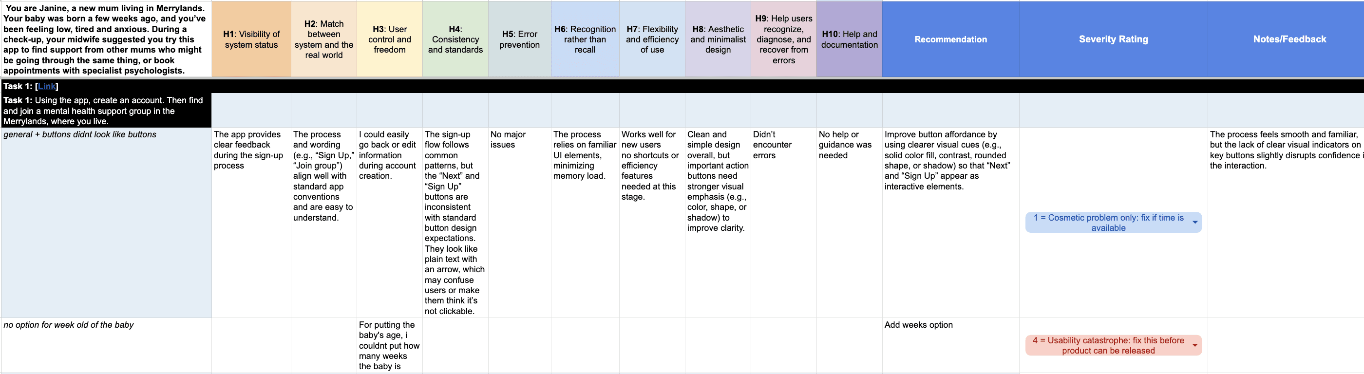 After making changes to our first high-fidelity prototype, we conducted heuristic testing with 2 experts. They provided us with rigorous and valuable feedback about our prototype’s aesthetics and usability for our final high-fidelity prototype. They tested both user flows against a criteria of Norman's Usability Heuristics, of which we applied a severity rating to indicate changes we should make.