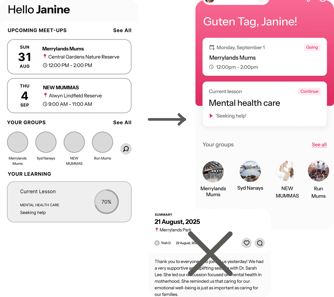 Additionally, we completed removed the "meetup summary" feature. It was discovered in user testing that mothers do not need this, as it would feel like "work" to catch up on meetups.