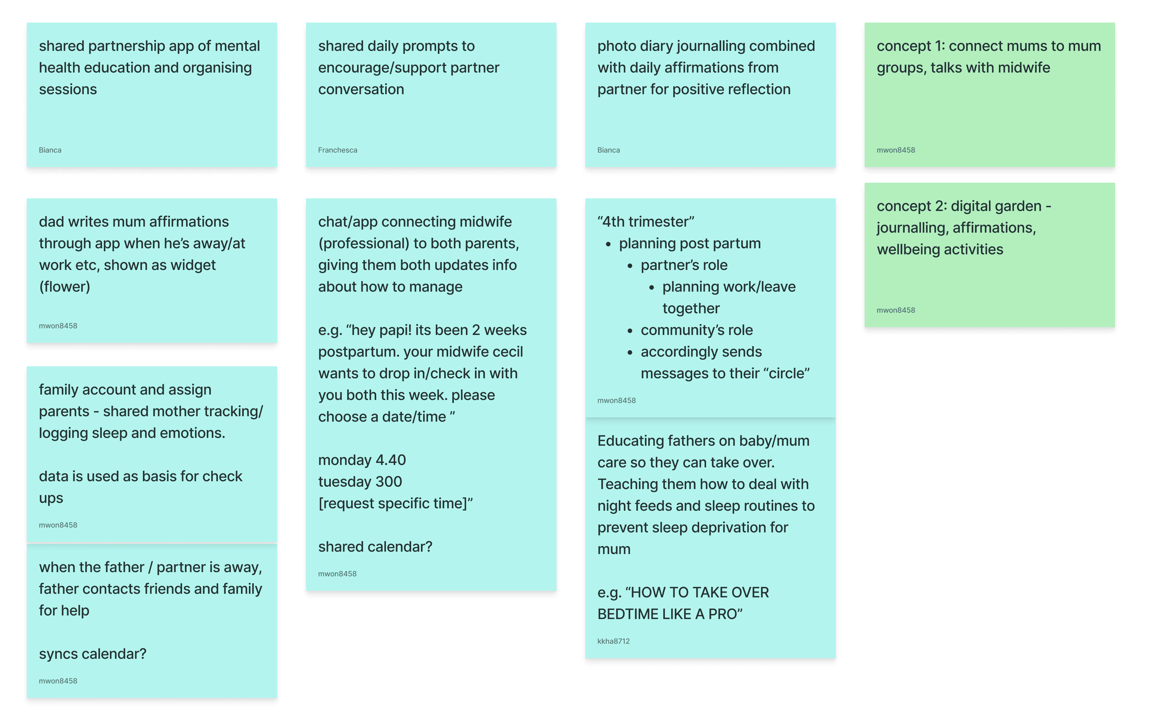 We began our ideation stage with Crazy 8s for rapid generation. Ideas were mostly focused on supporting the wellbeing of mothers, and providing ease as they transition into their new lifestyles.