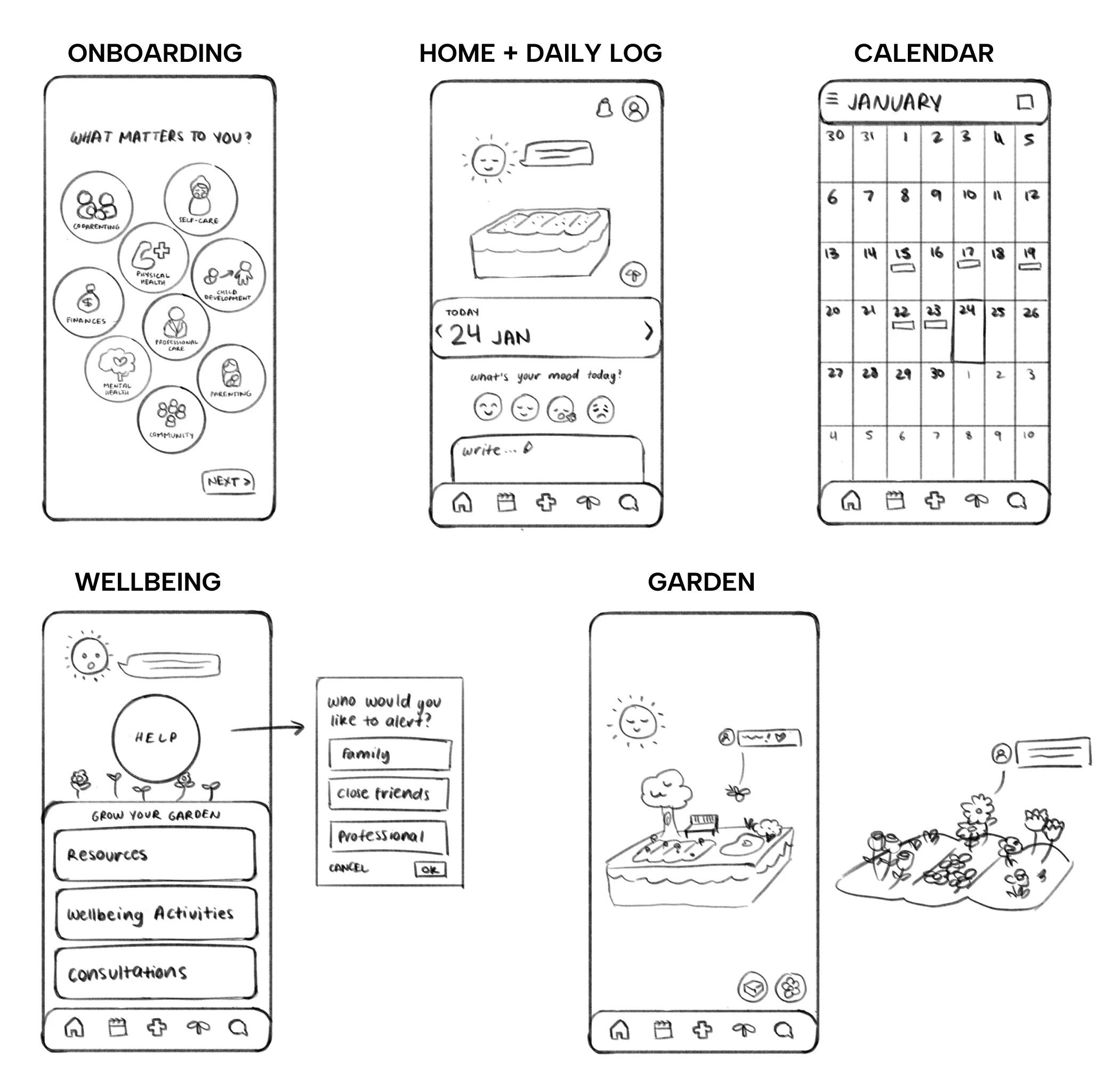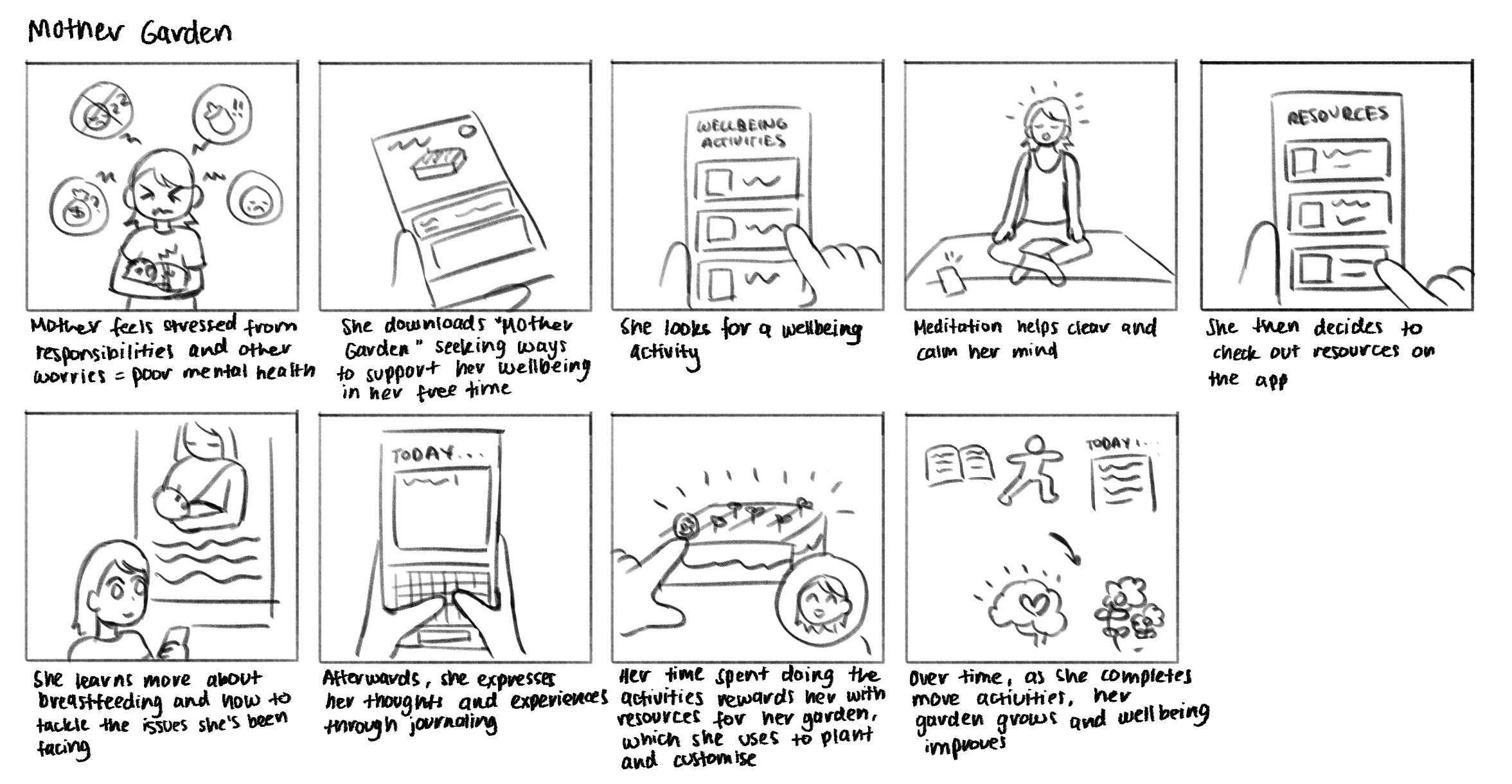A wellbeing app for mothers, in which they digitally nurture their garden as they partake in self-care activities, including journaling, self-affirmations, accessing resources and consultations for mental and emotional health.