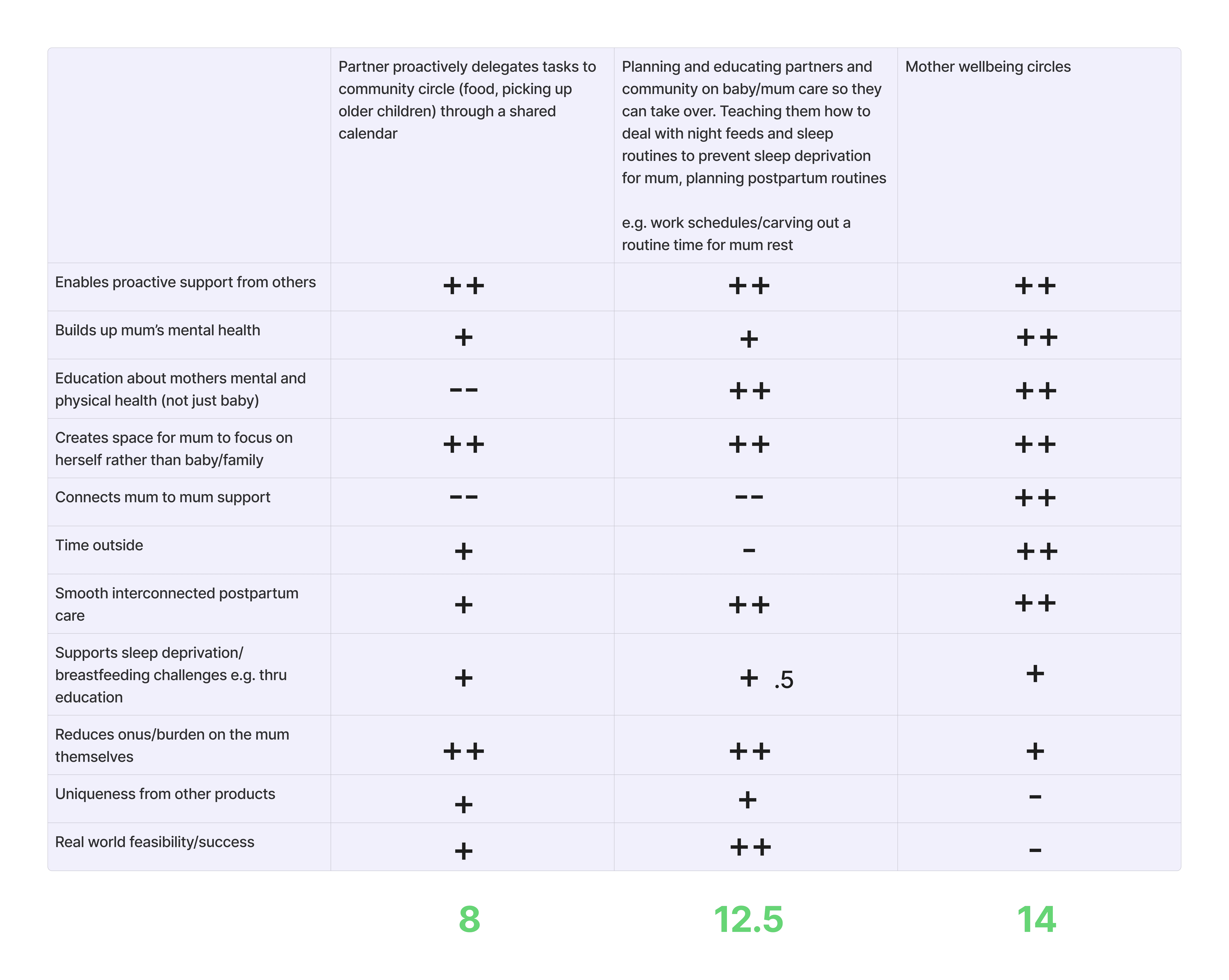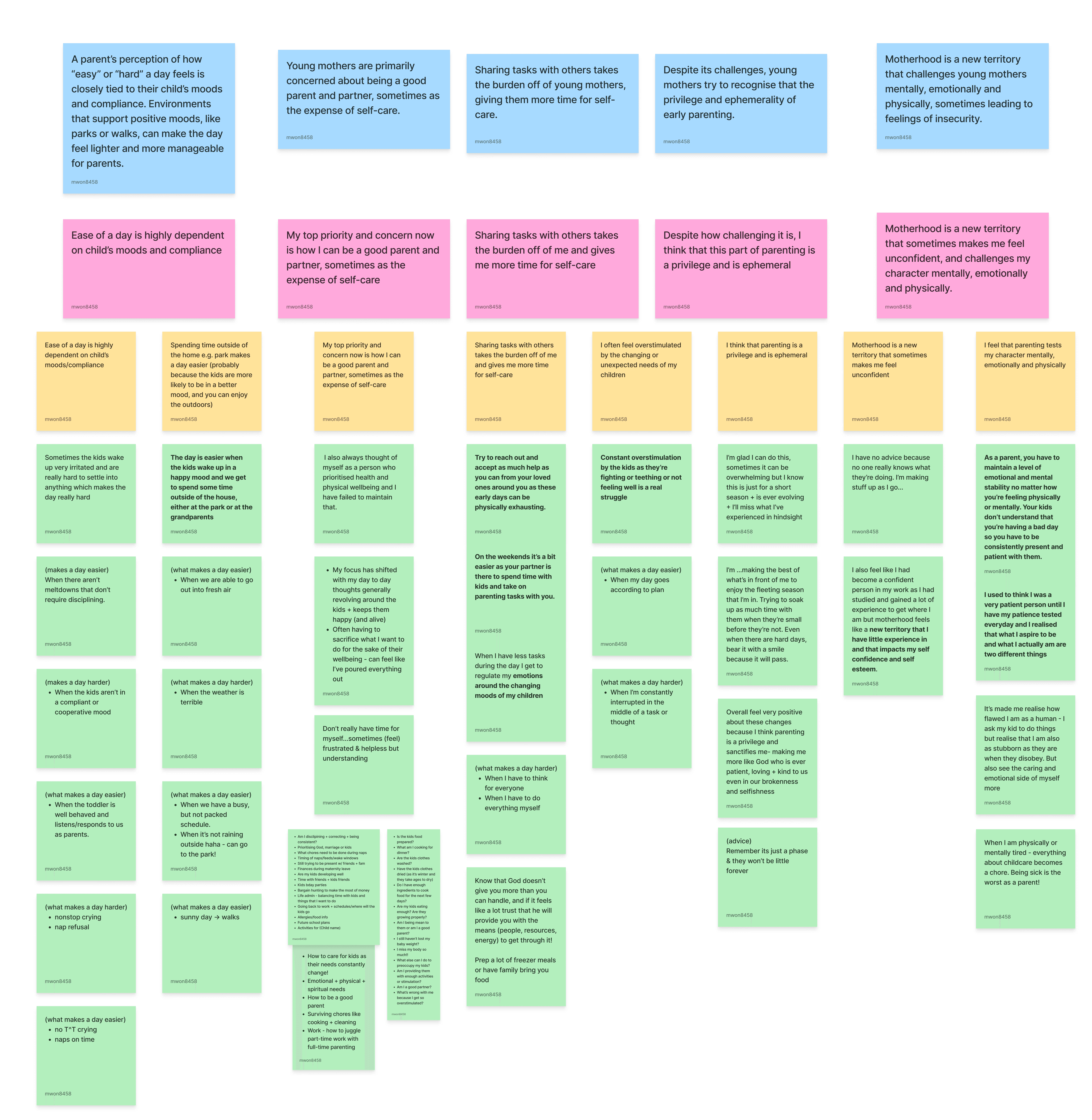 After gathering and coding quotes and observations, we conducted thematic analysis to define six themes that align with our key insights and highlight the level of support mothers need from their partners: