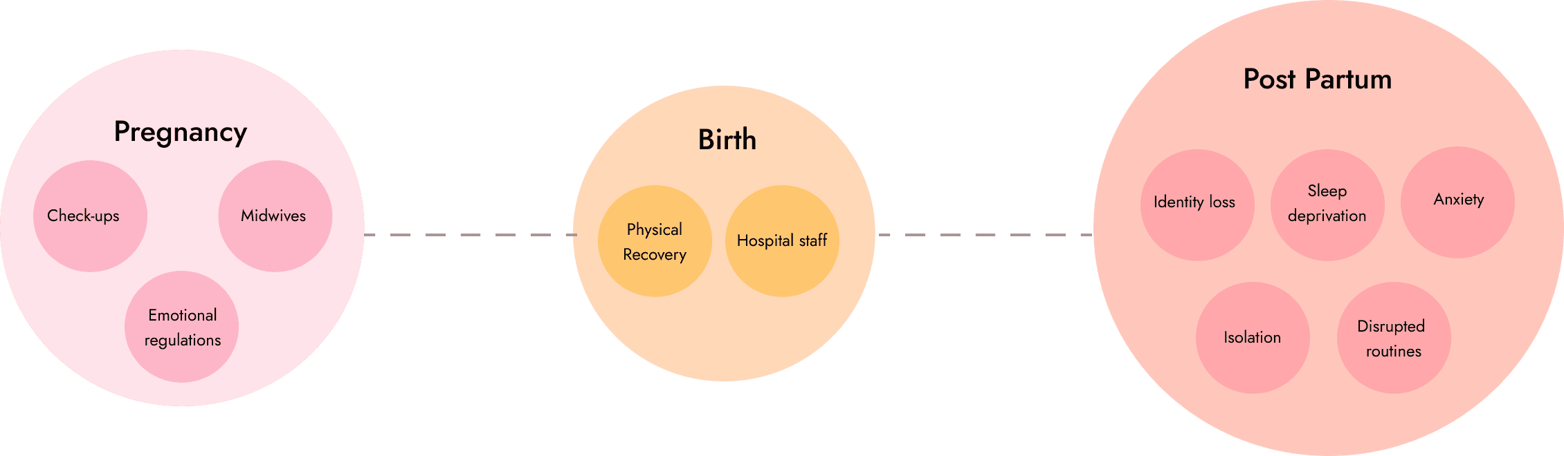 Designing for transitions. In this university studio project, we explored the transition into motherhood, highlighting the importance of a centralised and continuous maternal support system; one that helps new mothers to overcome mental and physical challenges.