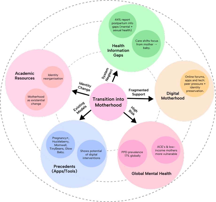 The complexity of a mother's transition is mirrored by the existing ecosystem surrounding mothers, involving healthcare providers, digital tools, online communities and peers. Whilst these all provide a level of support, they aren't interlinked or are hard to access, therefore creating gaps in the holistic care that new mothers need to overcome physical and mental challenges.