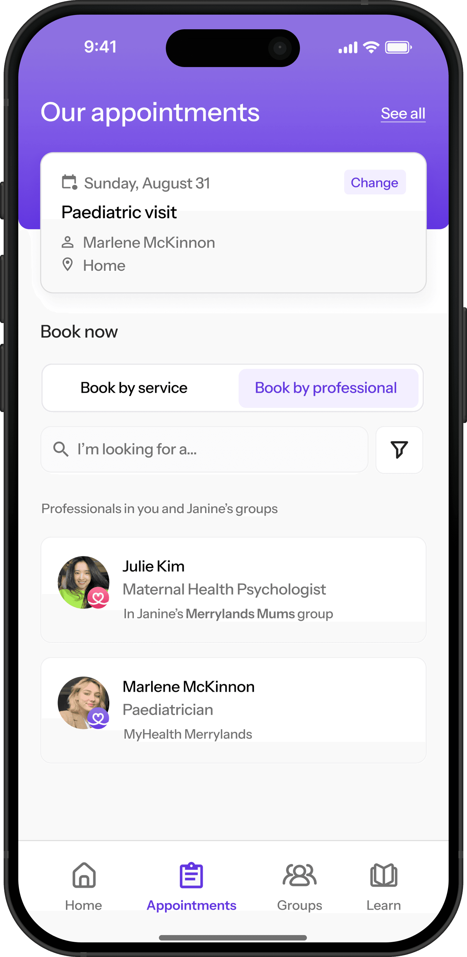 Mothers and partners can book appointments based on service type or trusted professional, according to personal needs.
